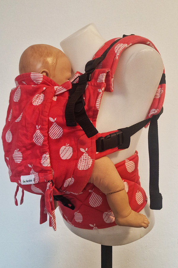 Ergonomické nosítko značky Be Lenka určené od narození a přibližně 3 kg do zhruba 86cm. Nosítko je plně nastavitelné na míru děťátka. Šířka nosítka se nastavuje velmi jednoduše pomocí stahovacích šňůrek umístěných na přední straně zádové opěrky těsně nad bederním pásem. V horní části zádové opěrky se nacházejí gumičky, pomocí kterých efektivně nastavíte šířku nosítka tak, aby byla fixována hlavička miminka, které ji ještě samo neudrží. Nastavitelná je i výška zádové opěrky, kterou dle potřeby stáhnete/povolíte pomocí stahovače v horní části zádové opěrky. Bederní pás je důmyslně navržen tak, aby se dokonale přizpůsobil každému typu postavy. Je měkký a pohodlný. Nosítko je vybaveno kapucí, která poslouží proti sluníčku, větru nebo na eliminaci okolního ruchu, když dítě v nosítku usne. Na uchycení kapuce slouží gumičky, které se přichytí na háčky umístěné na ramenních popruzích. Ramenní popruhy jsou klasické, ergonomicky tvarované bez možnosti křížení.