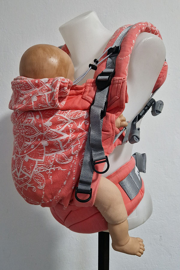Šířka i výška zádové opěrky je jednoduše regulovatelná a má stahování za krčkem. Šířka zádové opěrky se reguluje pomocí cvočků. Součástí nosítka je i obdélníková kapucka, kterou lze srolovat. Přidrží při spánku či ochrání před větrem nebo chladem vaše dítě. Na ramenou jsou oboustranné spony - je tedy možné ramena i křížit, ramenní popruhy pohodlně utáhnete s dítětem na břiše i na zádech. Mezilopatková spona je u nových nosítek magnetická pro snazší manipulaci. Veškerá nosítka Donkey baby jsou šitá z vypraných a vysrážených šátků tkaných z certifikovaných přízí.