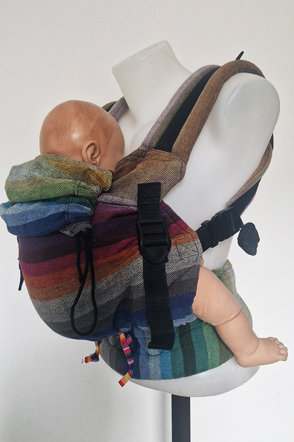 Nastavení šířky zádové opěrky pomocí šňůrky. Výška zádové opěrky se nastavuje popruhy, které jsou umístěny na boku zádového panelu. Nosítko má odepínací kapucku. Ramenní popruhy, které lze křížit s utahováním směrem nahoru jsou měkké a pohodlné. Nejsou vybaveny přezkami pro dotažení v přední části nosítka nad zádovým panelem.