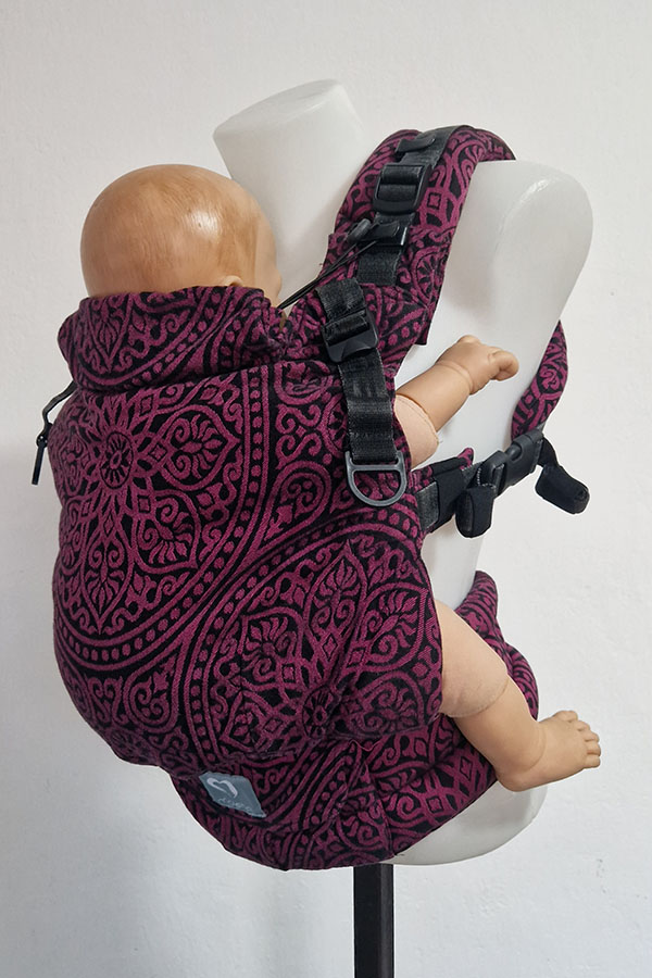 Flexibilní a pohodlný bederní pás. Rostoucí zádová opěrka a šířka sedu jsou nastavitelné pro 2 měsíční miminko až po větší batole (98-104 cm dle dispozic Vašeho dítěte). Nosítko má stahovací kapucku, které bezpečně fixuje hlavičku miminka. Nosítko je vhodné jak pro maminky od velikosti 34, ale i pro vysoké a statné tatínky. Umožňuje nošení na břiše i na zádech.