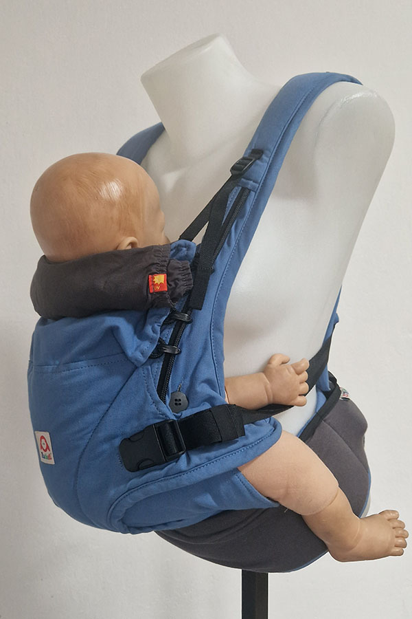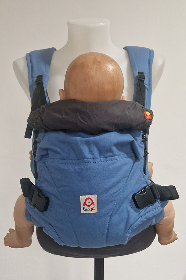 Ergonomické nosítko Ruckeli je nastavitelné podle velikosti dítěte, zádový panel nastavitelný od kolínka ke kolínku pomocí knoflíčků. Podporuje ergonomickou (M) polohu pro zdravý vývoj kyčelních kloubů a správné držení zad. Opěrka hlavy pro lepší zajištění spícího dítěte.