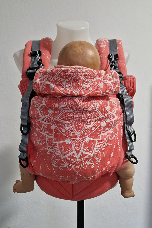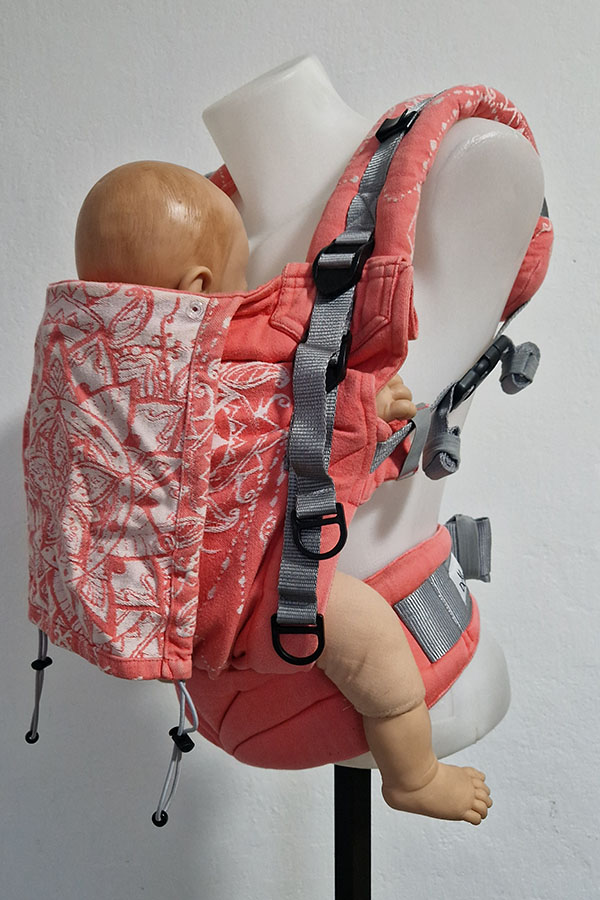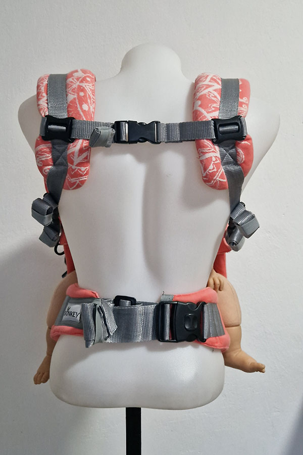Šířka i výška zádové opěrky je jednoduše regulovatelná a má stahování za krčkem. Šířka zádové opěrky se reguluje pomocí cvočků. Součástí nosítka je i obdélníková kapucka, kterou lze srolovat. Přidrží při spánku či ochrání před větrem nebo chladem vaše dítě. Na ramenou jsou oboustranné spony - je tedy možné ramena i křížit, ramenní popruhy pohodlně utáhnete s dítětem na břiše i na zádech. Mezilopatková spona je u nových nosítek magnetická pro snazší manipulaci. Veškerá nosítka Donkey baby jsou šitá z vypraných a vysrážených šátků tkaných z certifikovaných přízí.