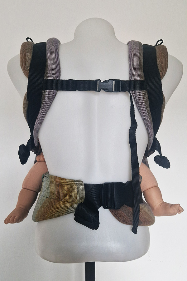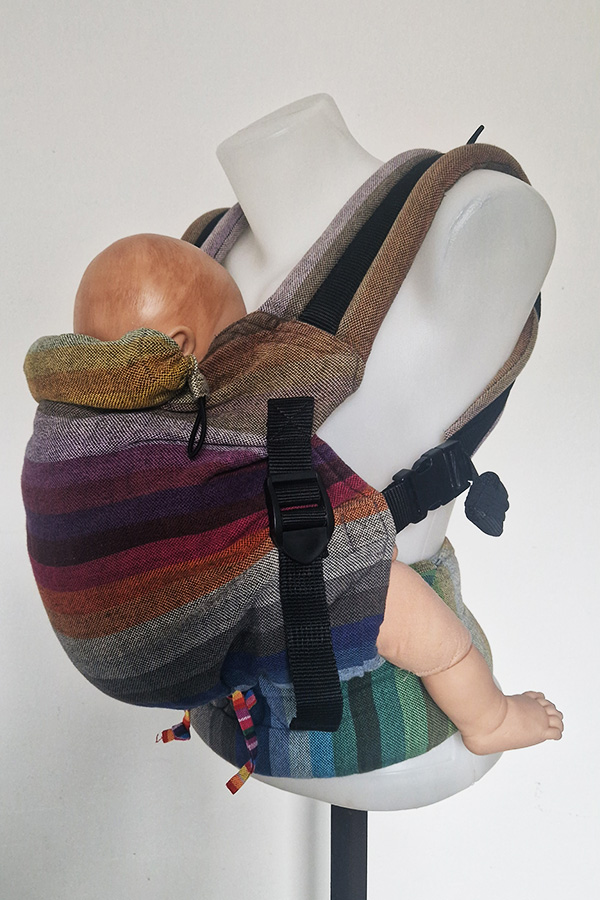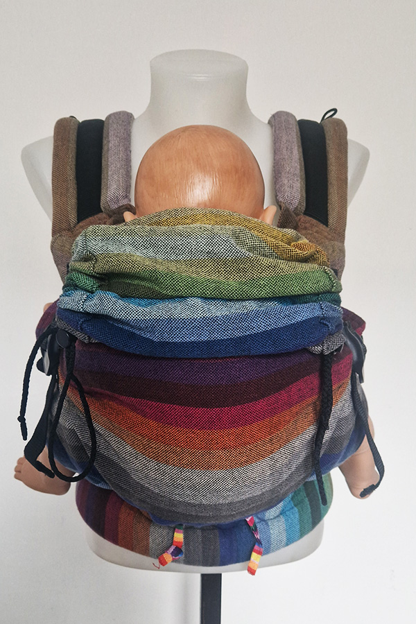 Nastavení šířky zádové opěrky pomocí šňůrky. Výška zádové opěrky se nastavuje popruhy, které jsou umístěny na boku zádového panelu. Nosítko má odepínací kapucku. Ramenní popruhy, které lze křížit s utahováním směrem nahoru jsou měkké a pohodlné. Nejsou vybaveny přezkami pro dotažení v přední části nosítka nad zádovým panelem.