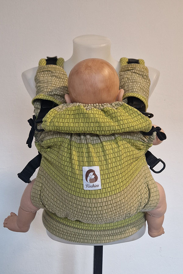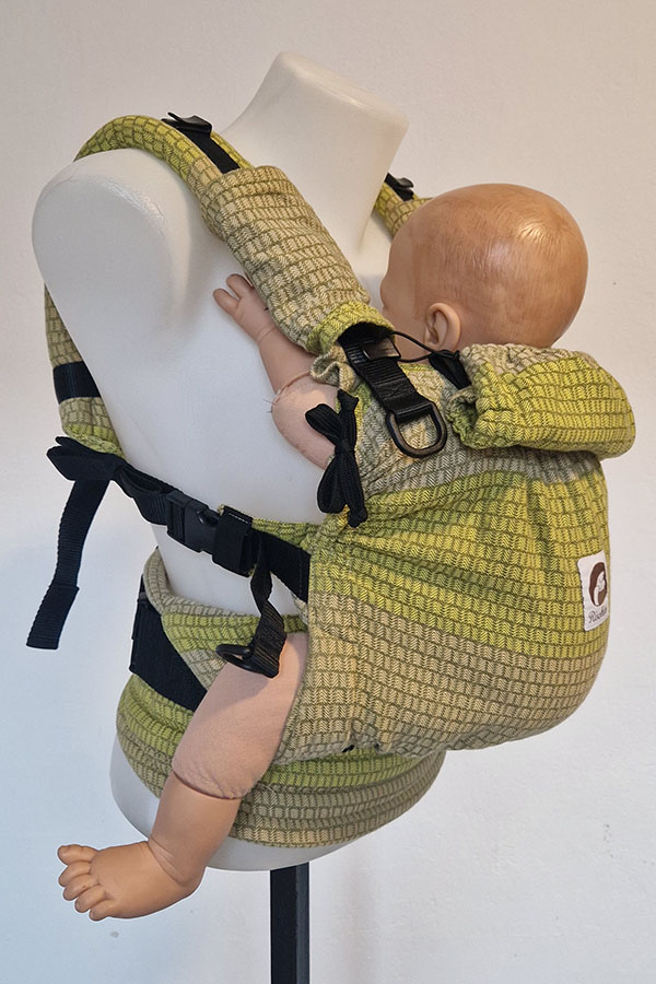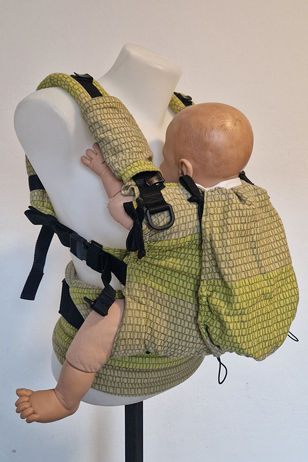 Fixační kapucka zabezpečuje fixaci hlavičky větších dětí.  Měkká ale konstrukčně pevná zádová opěrka plně respektuje přirozené zakřivení páteře děťátka a je navrhnutá tak, že se přizpůsobuje vývojovým fázím zad, čímž poskytuje dokonalou podporu zad. Zároveň je navrhnutá a upravená tak, aby poskytovala komfort a větší podporu i dětem vyššího věku. Je regulovatelná na výšku i šířku a umožňuje přesné nastavení dle velikosti Vašeho děťátka.