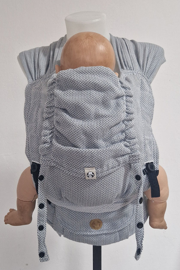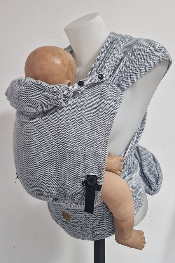 Bederní pás s kapsičkou na magnet pro uložení drobností. Šátkové popruhy, které je možné na ramenou doširoka rozprostřít, stabilizují polohu dítěte po stranách, což umožňuje bezpečné nošení malých dětí a také jsou zárukou vysokého komfortu při nošení. Zádová opěrka je volitelně nastavitelná do šířky i výšky - dle velikosti dítěte - do cca roka a půl. Díky tomu můžete nosítko vždy optimálně přizpůsobit dítěti a zajistit mu tak dobrou oporu páteře i podsazených nožiček. Úprava velikosti pomocí knoflíků.